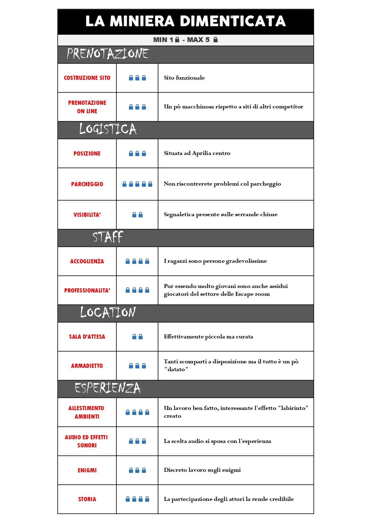 Il punto di forza de La miniera dimenticata è l'ambientazione. La scenografia è credibile e il design degli spazi ricrea un effetto labirintico perfetto, che garantisce l'immersione totale nel tema sotterraneo. Gli enigmi nel complesso sono ben costruiti e abbastanza coerenti con il contesto. Nonostante qualche piccolo intoppo sulla fluidità di certi puzzle è un lavoro di qualità. Ottimo l'inserimento degli attori. La loro presenza è un valore aggiunto che potenzia l'esperienza senza mai essere invasiva o spezzare il flow della sessione. Un'esperienza ben strutturata e coinvolgente che consigliamo a chi cerca adrenalina e realismo.